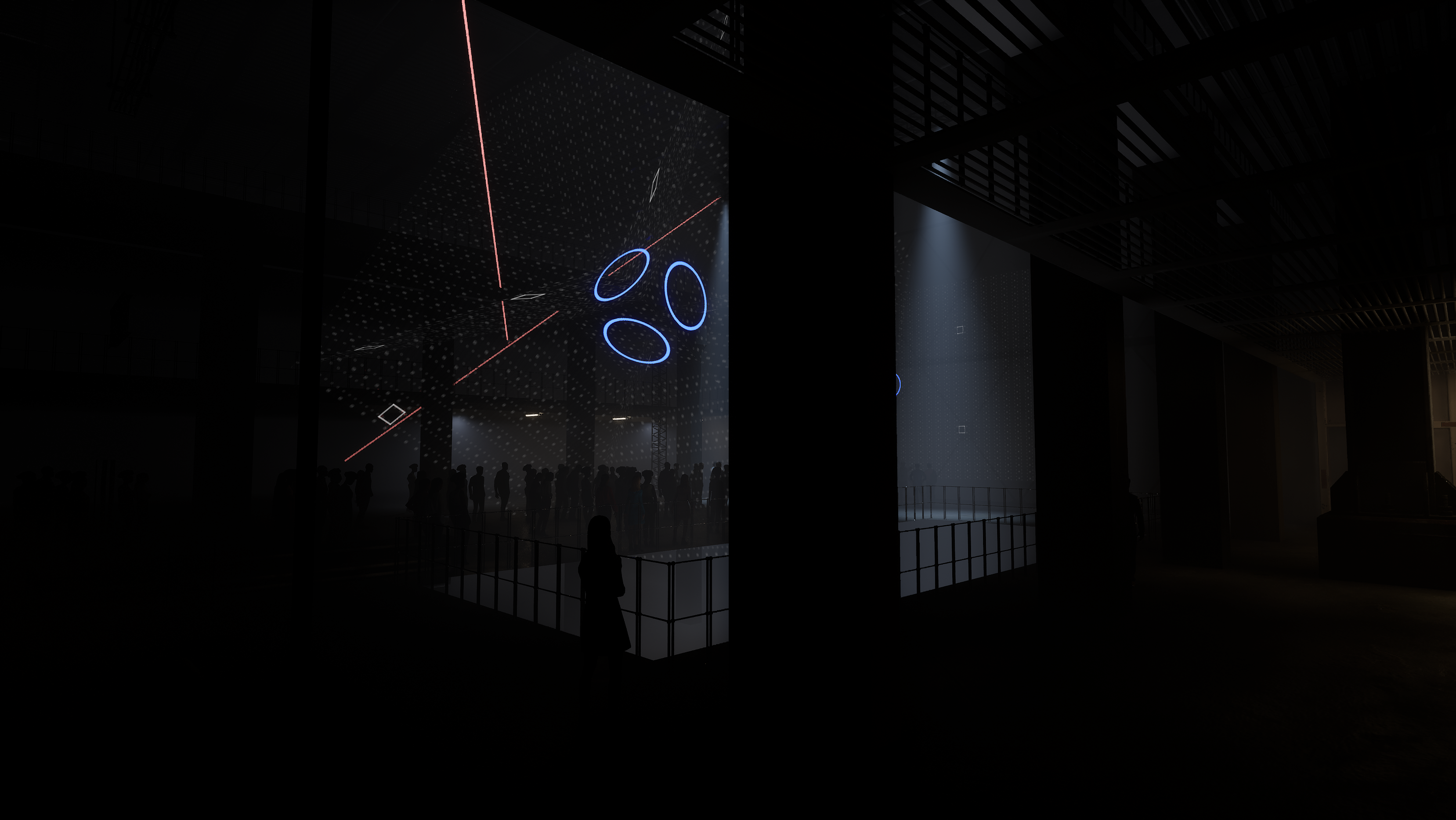 Spacefactory is inspired by the Kraftwerk events space in Berlin. It was modelled from photos of the venue, during a time when the idea of experiencing an installation had to be imagined. The 3D model was made in Blender, the audio-reactive network built in Touchdesigner, a full audio track made in Ableton with the final output coordinated in Unreal Engine reacting in realtime.